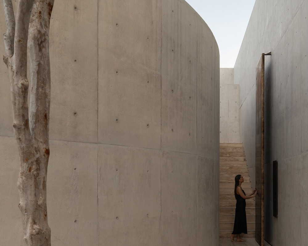 Le camere da letto sono disposte attorno a un patio, alla ricerca di silenzio e aria. Qui, l'intimità si esprime attraverso la delimitazione, non come confinamento, ma come mondo interiore. Una parete curva accoglie e accompagna il visitatore, segnando una soglia accogliente, mentre un albero dà il benvenuto come una composizione floreale.