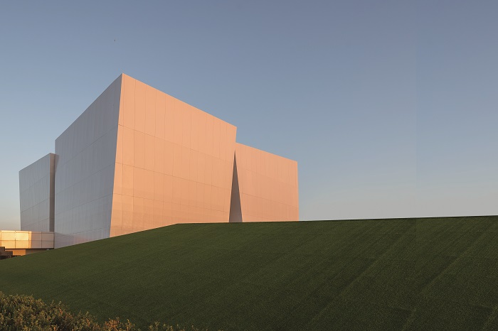 L’edificio è avvolto da un rivestimento perforato che forma uno spazio relativamente chiuso. Le sezioni della facciata continua sono inclinate, raggruppate e intrecciate all’interno e lo spazio tra le sezioni forma naturalmente l’ingresso dell’edificio. Al calare della notte, la luce filtra attraverso le piastre forate e fa risplendere l’intera costruzione, come un pezzo di marmo lucido.